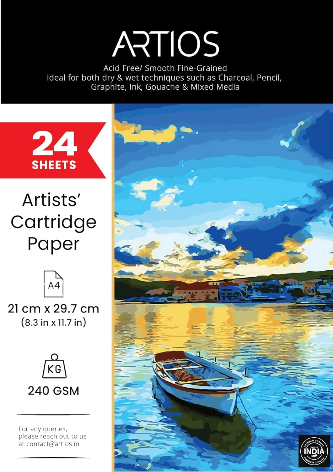 ARTIOS Mixed Media Cartridge Paper A4 240 GSM – 24 Drawing Sheets for Artists, Ideal for Charcoal, Graphite, Acrylic, Watercolor, Gouache, Ink, & Other Mixed Media